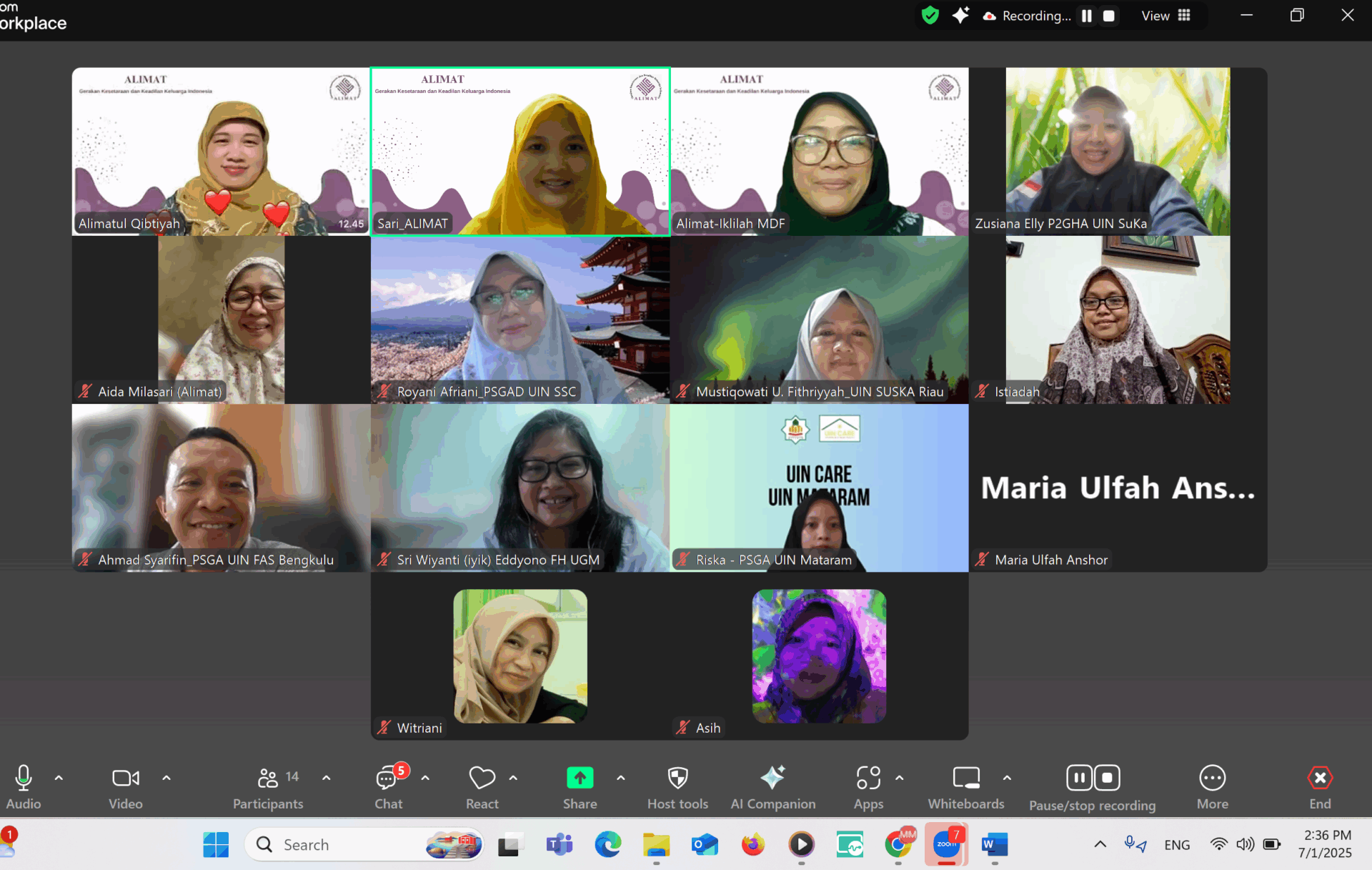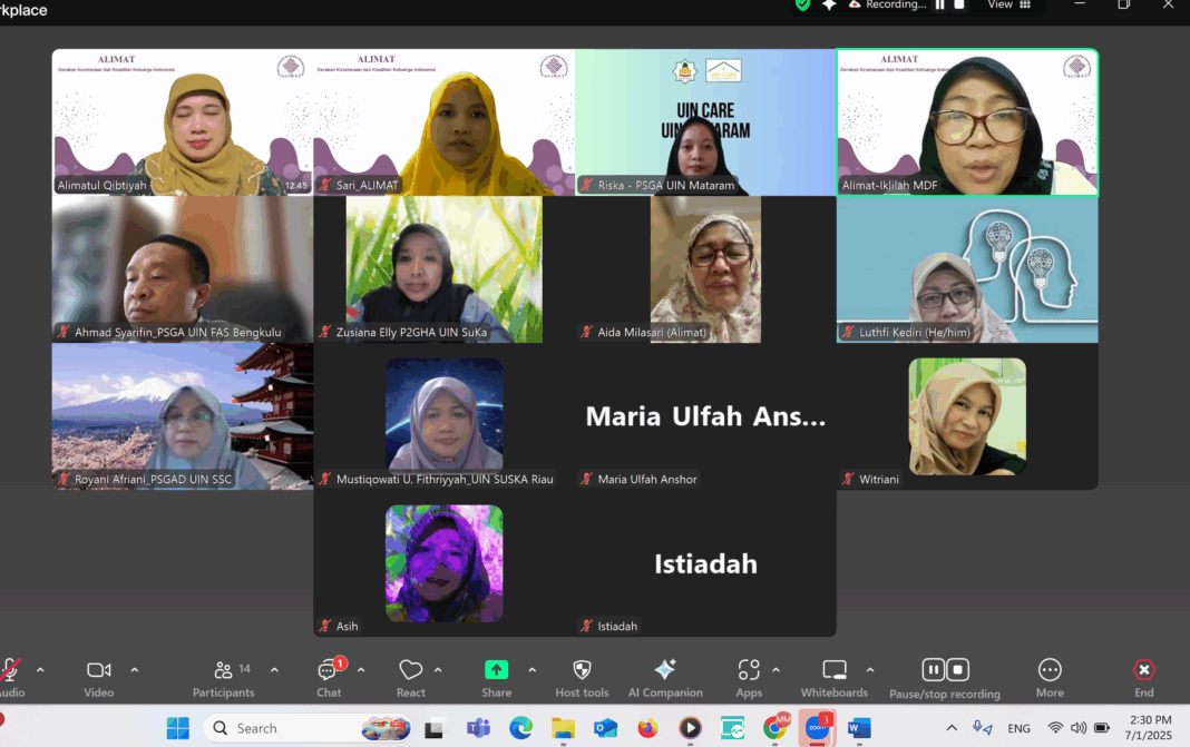 FGD Online, Konsolidasi Tim Modul Short Course Alimat – Forum PSGA, 1 Juli 2025 Galeri Kegiatan 1 Juli 2025 By alimator Less than 1 min. read FGD Online, Konsolidasi Tim Modul Short Course Alimat – Forum PSGA, 1 Juli 2025 Lainnya Bulan Kebangkitan Ulama Perempuan Indonesia (BKUPI), 18 Mei 2025 Galeri Kegiatan 19 Mei 2025 Sosialisasi Fatwa KUPI tentang P2GP di UIN Sultan Syarif Kasim Riau Galeri Kegiatan 18 Mei 2025 Sosialisasi Fatwa KUPI tentang P2GP di UIN Bandung Galeri Kegiatan 18 Mei 2025